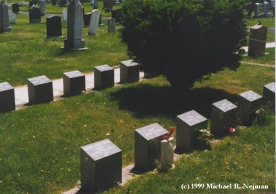 In the Mount Olivet Cemetery, there are 19 victims, all with simple markers, in two straight rows. |